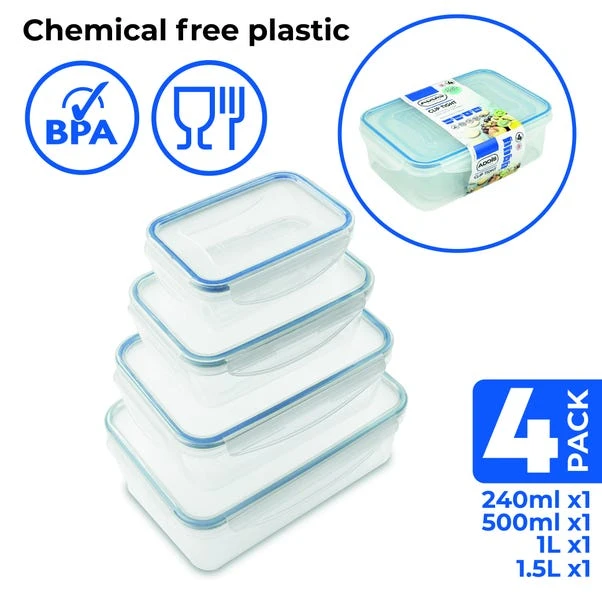Freshness meets versatility! This set of 4 rectangular containers keeps your food deliciously fresh with silicone-sealed lids and lock-tight clips. When you’re done, they nest neatly to save space. Perfect for pantry perfectionists!
