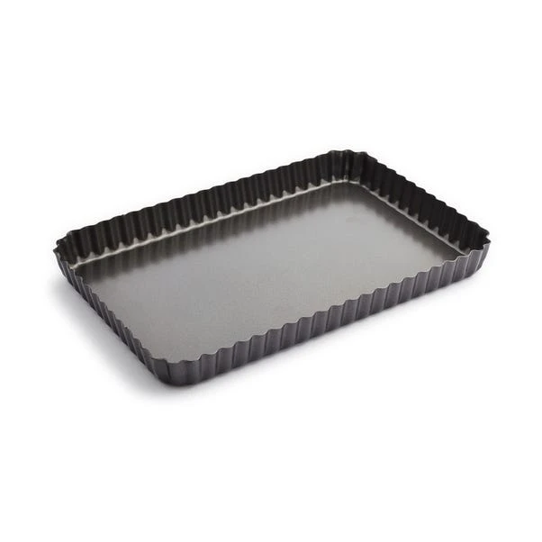Create elegant flans, tarts, and quiches with our heavy-duty, deep-fluted rectangular tin. The double non-stick coating and loose base ensure quick release. Freezer, fridge, and dishwasher safe, this tray is designed for culinary excellence with a 20-year guarantee.