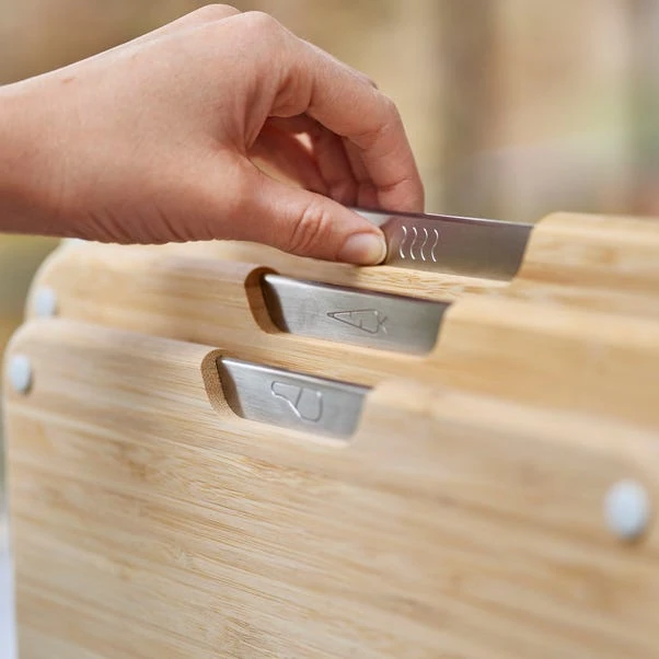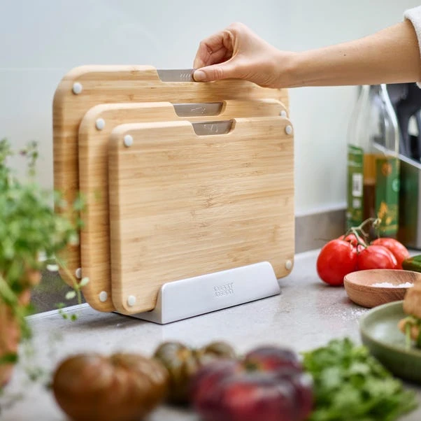 Introducing the Joseph Joseph Nest Bamboo Boards, the perfect blend of functionality and style for your kitchen. This set includes three double-sided chopping boards, each featuring food-specific icons to prevent cross-contamination and ensure safe food preparation. With tough bamboo cutting surfaces and non-slip feet, these boards offer durability and stability while you work. The easy-access stainless-steel tabs add a touch of elegance and convenience. Plus, the innovative metal stand holds the boards apart, allowing air to circulate for hygienic drying. Upgrade your kitchen essentials with the Joseph Joseph Nest Bamboo Boards – the ideal solution for organized, safe, and stylish food preparation.