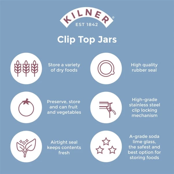 Whether you’re pickling your vegetables or storing dry goods like pasta or rice, this 1.5 litre Kilner jar is the perfect size for doing just that! It’s a great way of space saving and keeping surfaces clear of clutter and is complete with a rubber seal to keep your contents fresh for longer and a clip top lid.