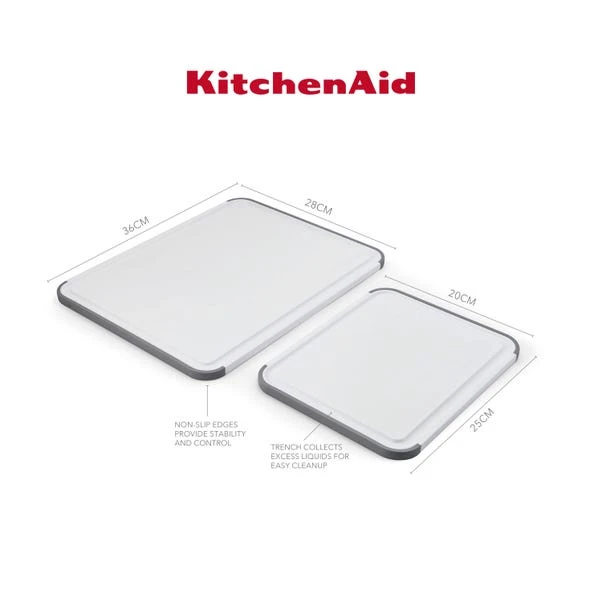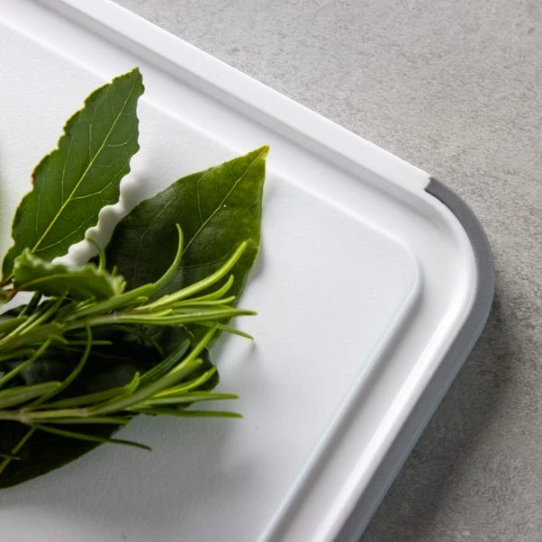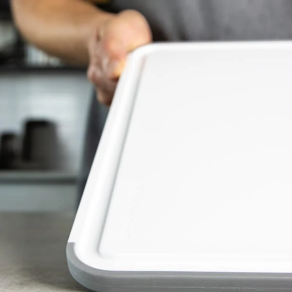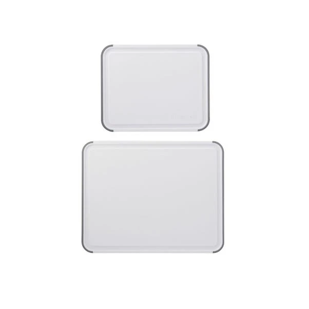 A set of chopping boards that can help you cut and chop your way to culinary success. The non slip edges help to give you more stability and control while the perimeter trench can collect excess liquids. Worried about your knives becoming blunt? No need to worry as the plastic is non-absorbent and gentle on knives. These chopping boards are engineered to maintain their shape over time so you can use it for use after use. As the boards are reversible, you get double the cutting surface!