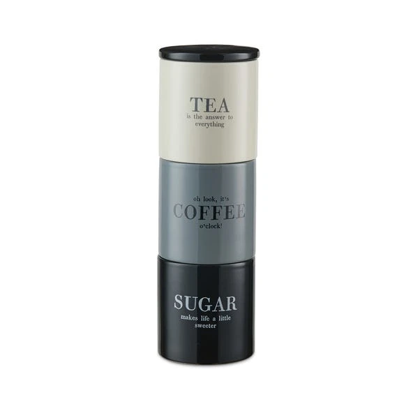 Made from stoneware with a modern monochrome design, this set of stacking tea coffee sugar canisters will look modern and stylish on any kitchen worktop and are perfect for neat space saving storage.