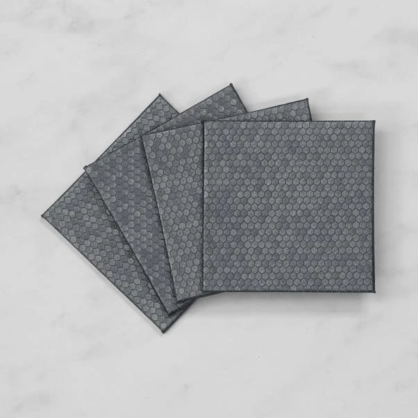 Add a touch of luxury to your coffee table with this Set of 4 Silver Honeycomb Coasters! Designed to complement the matching placemats, these coasters bring a contemporary sparkle to any setting. Heat resistant and protective, they ensure your surfaces stay pristine while making every drink feel just a little more special. Perfect for entertaining or simply elevating your daily tea break!