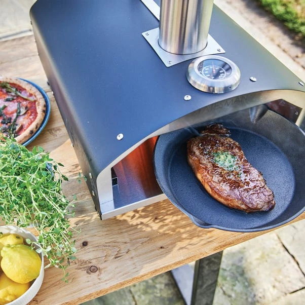 Take your garden gatherings to the next level with the Statesman 13 Inch Wood Fired Pizza Oven. Powered by a wood pellet fuel system, it delivers fast cooking times and authentic smoky flavours, so you can enjoy stone-baked pizzas in just 3 minutes. With a top temperature of 470°C, this oven is perfect for cooking everything from succulent steaks to fresh fish, juicy veggies, and even bread. The built-in temperature gauge lets you monitor and adjust the heat, ensuring your dishes are cooked to perfection. For an authentic pizzeria experience, a 12-inch pizza peel is included, making it easy to load and remove your creations. The waterproof storage cover keeps your oven protected and looking great, even when not in use.