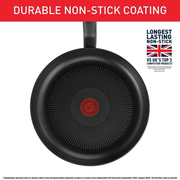 If you’re looking for a frying pan that’s going to give you superb non-stick for years, is durably made and turns out delicious results whatever you want to cook – you’ve found it. Tefal Titanium Ultra has the Longest Lasting Non-Stick Vs UK’s Top 3 Competitor Products*. The Thermo-Signal is our clearest ever way to indicate that the pan is at the right temperature to start cooking. The Titanium Ultra frying pan is compatible with all hobs excluding induction. *Longest Lasting Non-Stick Vs UK’s Top 3 Competitor Products: Independent abrasion tests in January 2024 of top-selling branded competitor products in volume from Independent UK Panel Data (September 2022-August 2023). Verification: tefal.co.uk/verification.