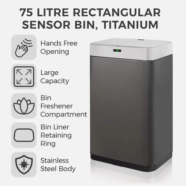 Designed by Tower, this 75 litre rectangular sensor bin features a sleek and contemporary style with a sensor activated lid. Crafted with a robust stainless steel body with a modern colour coating, this rectangular sensor bin offers a large hygienic opening for ease of placing waste. The lid opens automatically within 5 to 15cm and it is supplied with a one year guarantee.