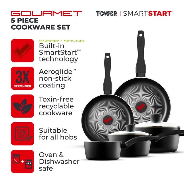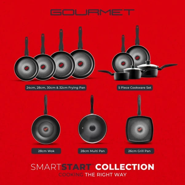 Your home could always use a pan set that helps you cook like a pro, and this pan set will do just that! This 5 piece cookware set offers great versatility with 20cm/24cm frying pans, a 16cm milk pan and 18cm/20cm saucepans. Presenting innovative SmartStart technology with a built-in temperature sensor to cook like a Pro. Put the pan onto the heat and wait for the SmartStart tick to change to dark red to start cooking. Each pan is ultra-tough with expertly crafted 3mm thick aluminium. Great heat conductivity properties and lightweight design ensure rapid heat-up and easy manoeuvrability. Straight side walls give 15% more cooking space, ideal for family-sized meals. The innovative Aeroglide non-stick coating is 3x stronger than standard non-stick coatings. The Aeroglide coating provides superior food release, is easy to clean and is dishwasher safe. The pan is oven safe up to 170C for 40 minutes. All SmartStart pans are free from harmful chemicals such as PFOA, Lead and Cadmium. Sustainable materials have been used, with fully recyclable products and packaging. Suitable for all hob types, even induction.